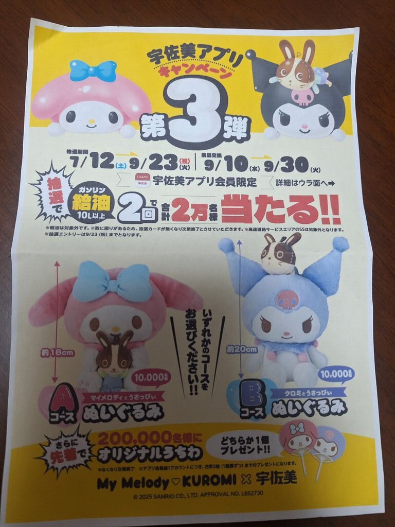 ガソリン給油10L以上給油2回でエントリーできてマイメロディorクロミのぬいぐるみが2万名に当たるという、宇佐美アプリキャンペーン第3弾を知り、通っていました☆応募ハガキをタウンロードして応募券を貼り付け持って行ったのですが、遅かったぁー!まだキャンペーン期間中ですが、既に抽選カードの配布は終わってしまったそうです。私が甘かったです。でも、毎度会員価格&クーポン値引きでお得に給油できて嬉しいです(^ー^) (訪問:2025/09/09)