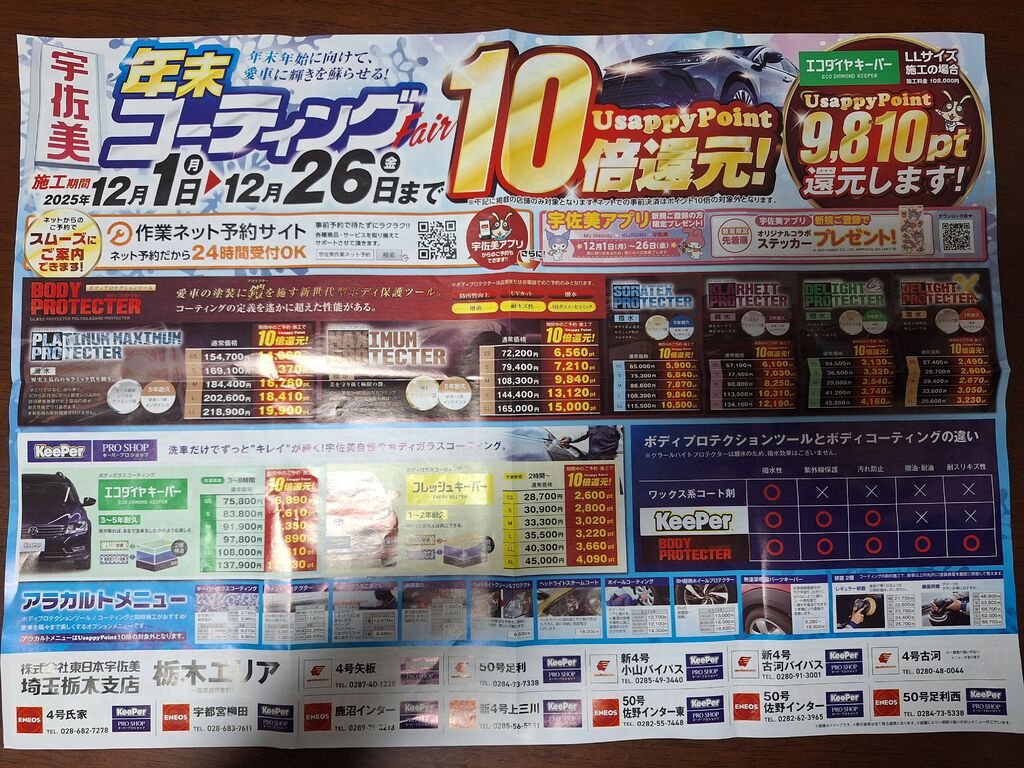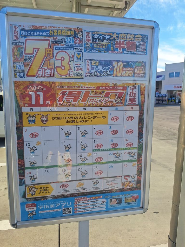 念願の“オリジナルコラボデザインアクリルキーホルダー”プレゼントをいただきました☆カウンターで「レシートクーポン貼付け済み台紙」と「アプリクーポン」を提示で景品1個と引き換えとなります。何が出るかはお楽しみです。“ウインクマイメロディ×ぬいぐるみうさっぴい”をGETしました。お得なクーポンを使用して給油したので、またもう一つ欲しいです♪年末コーティングフェアのお知らせを貰いました。タイヤも安いです(^ー^) (訪問:2025/11/22)