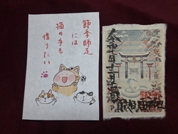毎月の月詣でで参拝に。いつも通り全てのお社にご挨拶をと、参集殿に向かうとずでーんと、ヒメちゃんが涼み中。ヒメちゃんよ、そこは神様のおうちですよ?とお声がけするも、そ知らぬ顔。お参り中バリバリ音が聞こえ、音の方角を見ると、神様のおうちでバリバリ詰め研ぎ中のヒメちゃん。いつかバチが当たりそうな予感^^; 夏場は風も吹き抜け日陰になる参集殿によく居るヒメちゃん。ゆっくり寝ていたいときに居る雰囲気。ナデナデすると眠いところプロ根性で愛想を振り撒いてくれるので、ここではそっとしつつ見守りを。夏バテせず暑い夏を元気に乗りきって欲しいものです。お参り後に社務所に行くと昨年度他の神社でお見かけした、その神社にゆかりのある動物をかたどった朱印があり、こちらでは賀茂別雷大神様に縁深い八咫烏が仲間入り。良い方向に導いてくれそうな素敵なデザインに心奪われ頂きました。週末の奈良ドライブ、よいところに導いてくれそう♪型抜き朱印、新しい顔ぶれやデザインにもなり、今年も注目な予感です。 (訪問:2025/07/13)