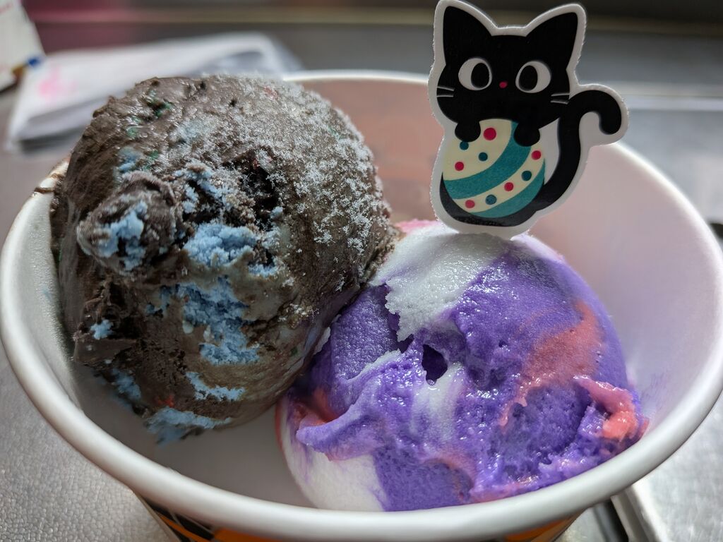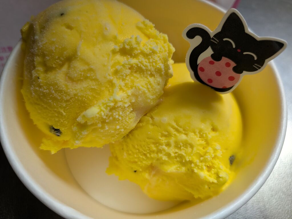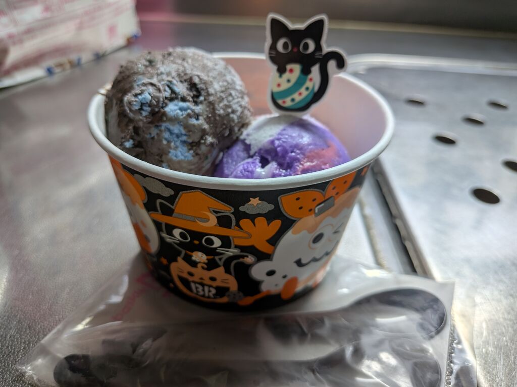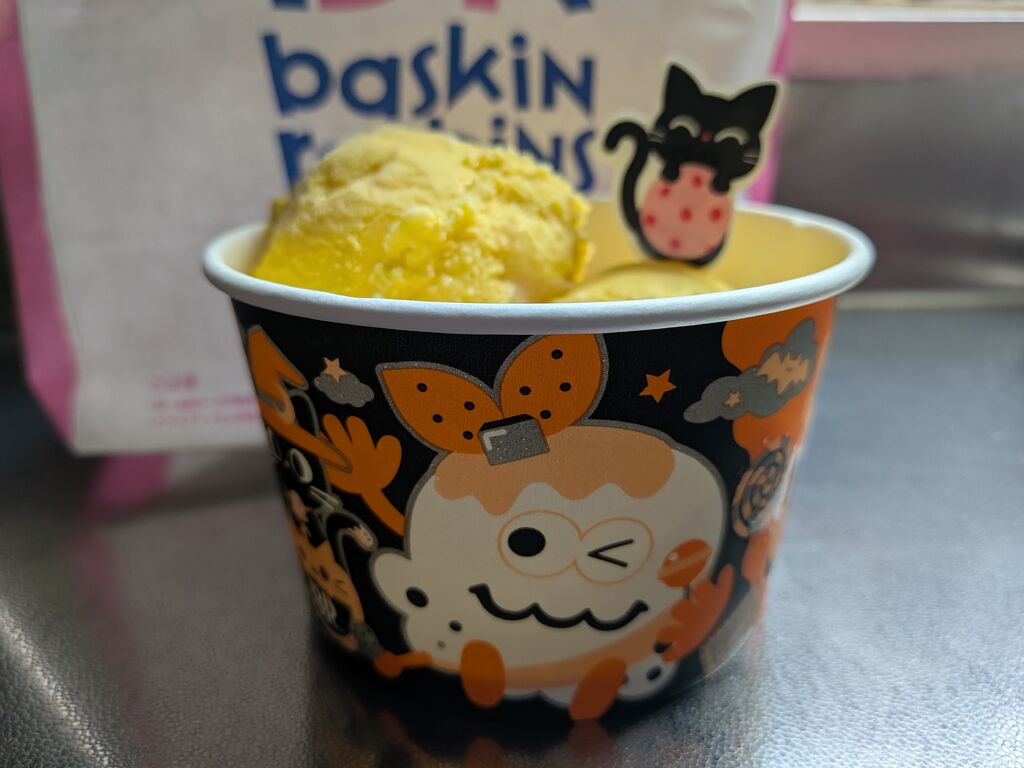月夜のおさつバター黒ごま入りをいただきました。黒ねこピック付きのにゃブルカップ、まじかわいい。しかも10月の新作フレーバーは、私の大好きさつまいも!!!!!。即購入です。実物見ると、ますますかわいいにゃブルカップ。じっくり堪能したいけど、溶けちゃうので、早速いただきます。おさつバターまじ旨いです。さつまいも風味とバター風味の見事なコラボ。黒ごまクリスプが凄い良いアクセント。ねこ様の足跡をイメージているだけあって、食感も風味も素晴らしいです。もちろん、食べ終わった後のカップやピックは、きれいに洗って家のインテリアになってます。 (訪問:2025/10/03)