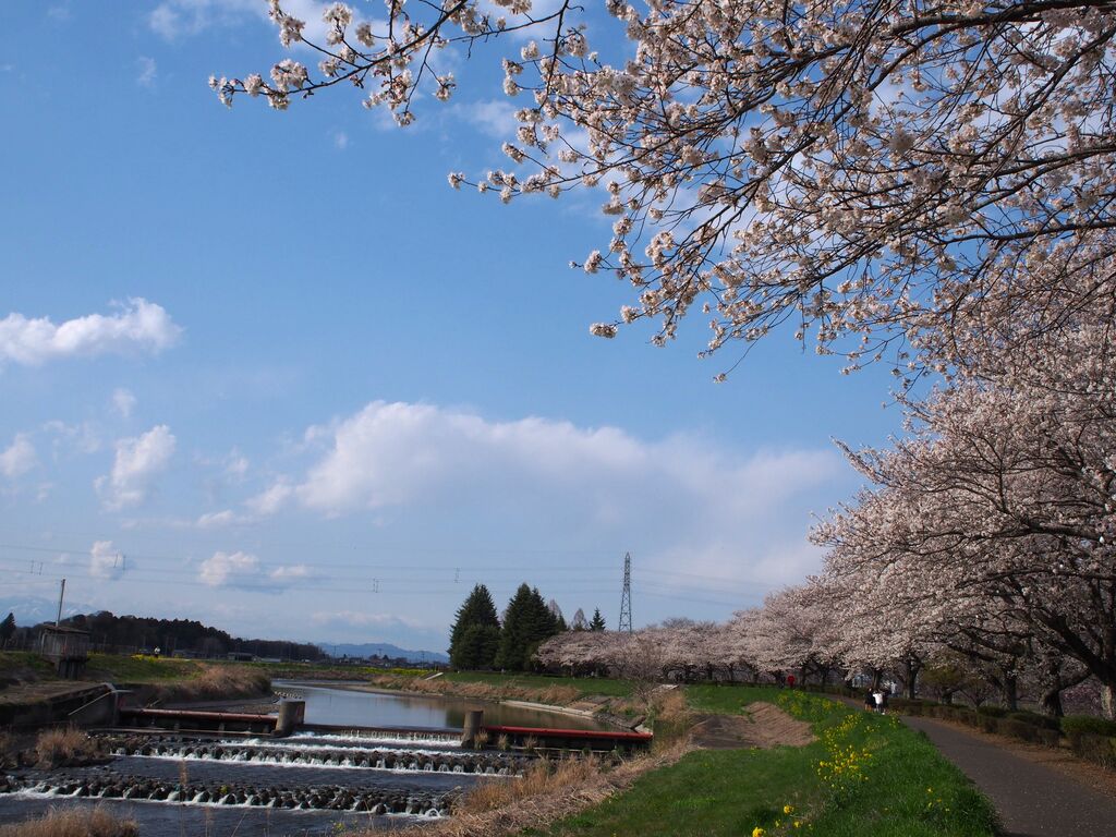 川と桜と菜の花と…カーブを切りながら続く桜並木は遠くまで眺められてまた美しいです♪のんびりと散策する皆さんを拝見すると、自分の気持ちもゆったりのんびり癒されるのを感じます♡ (訪問:2025/04/07)