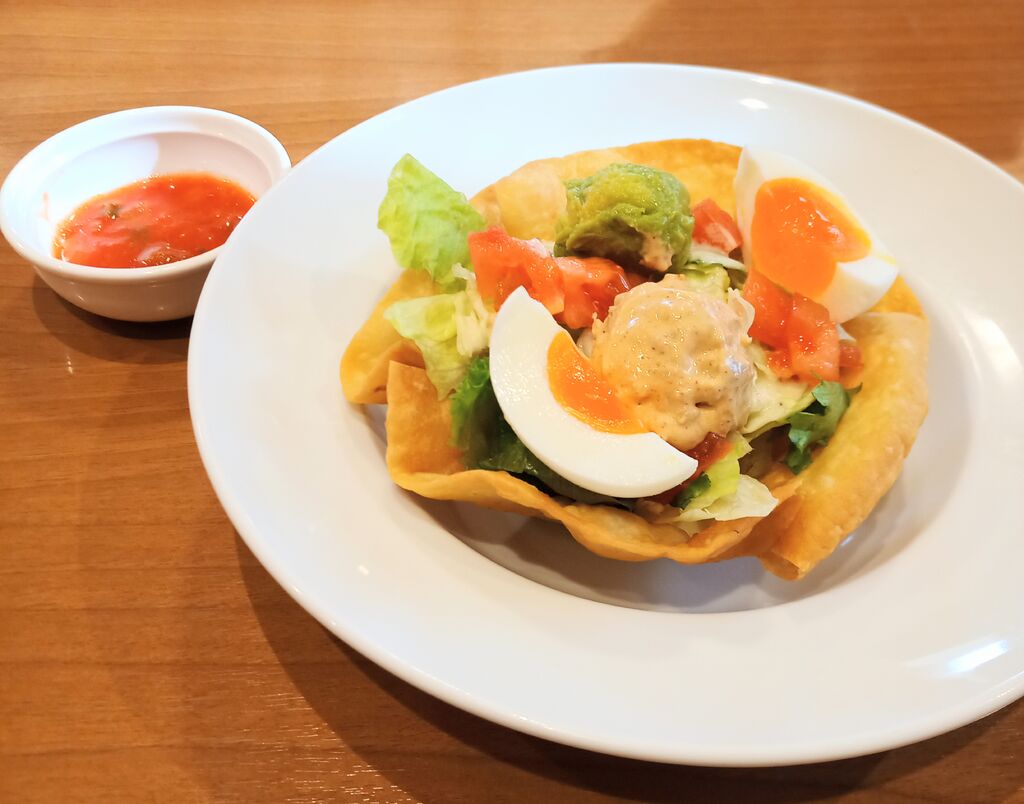 タコサラダが美味しいと聞いて、「カリフォルニアタコサラダ」を食べてみました。少しピリ辛なサルサソースがついたメキシカンサラダです。サクサクのシェルをくずして、野菜と一緒に食べると美味しかったです。ドリンクバーの紅茶の種類が多く、選べるのも楽しいです。 (訪問:2025/11/23)