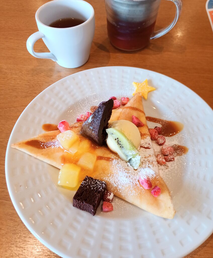 「もみの木クレープ」を食べました。クリスマスツリーのように飾り付けられたクレープです。生地の中にはホイップクリームが入っていて、トッピングは星チョコやガトーショコラ、バニラアイス、フルーツ等が盛り沢山です。塩キャラメルソースも甘じょっぱくて美味しいです。アプリのクーポン割引で590円→390円になりました。 (訪問:2025/12/20)