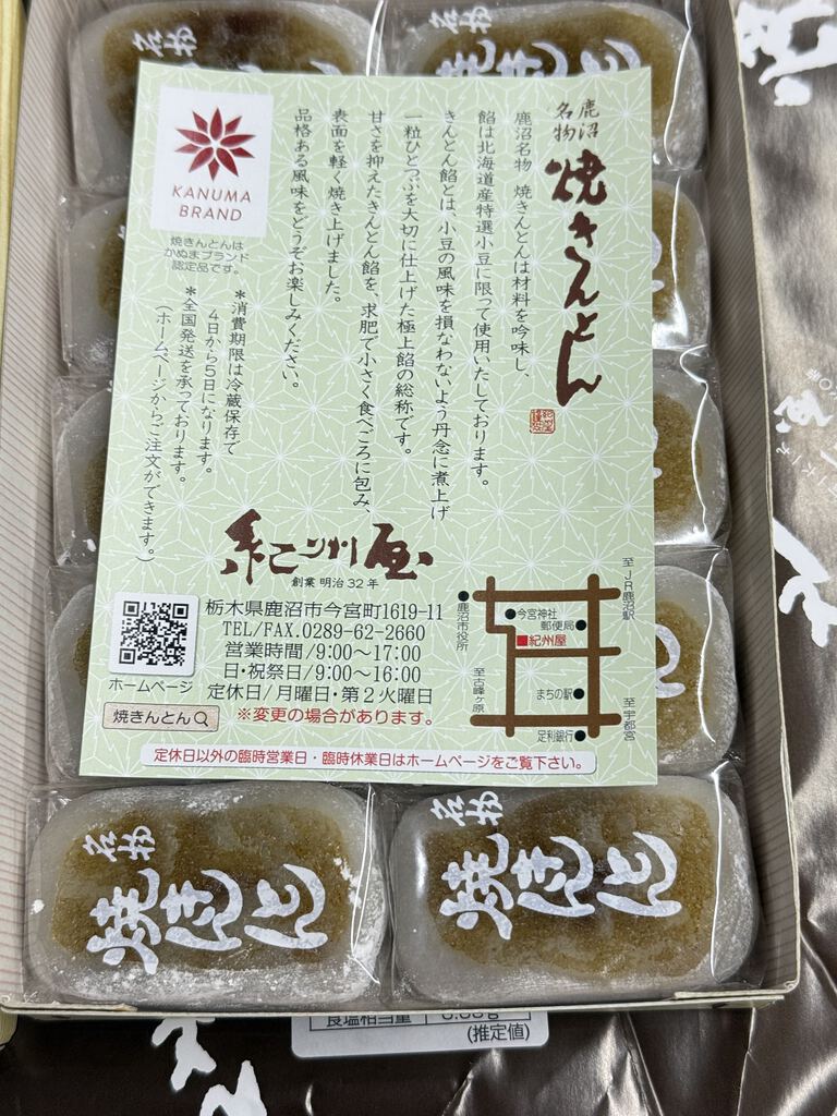 倅のお土産にやききんとんを購入しました。お値段もお手頃で、味は間違いなし。ウチの家族もみんな大好きなやききんとんは鹿沼の逸品だと思います。 (訪問:2025/10/11)