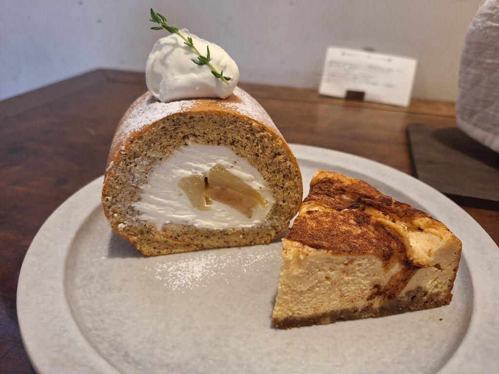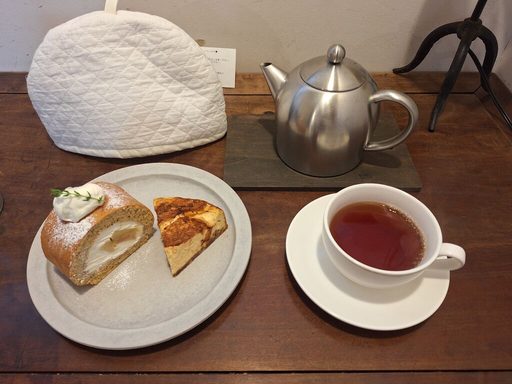 SNSで拝見した『りんごのベイクドチーズケーキ700円』が食べたくて16時頃突撃しちゃいました。満席で入店できないこともある人気のこちら、珍しくどなたもおらずいっつも気になっていた奥のお席に着席。ベイクドのみでと思ってましたが、やっぱりロールケーキも気になる‼ということで『アップルティーの生ロール700円』に『ホットティーポットサービス800円』の贅沢オーダーを^^ベイクドチーズケーキ自体、くどすぎず酸味が効きすぎず、りんごと仲良しでりんごに花を持たせてくれるような主張しすぎないけど主役級の美味しいケーキ。そもそもこれが美味しくて、さらにシナモンたっぷりのりんごも絶品で…。美味しくないわけ無い逸品☆ロールケーキはふんわりしっとりの生地に美味しい生クリームとシャキッとした歯応えも残る煮林檎で爽やかなお味♪こちらも美味しすぎて、一人にやにやしながらいただいてしまいました。他のお客様に見られていたら絶対怪しいやつと思われるレベルのニヤニヤでした。おやつが目の前に2品、なんとも幸せな時間を過ごさせていただいたものです。たっぷりポットでいただける紅茶も、この日は足らないのでは?と思ってしまうほど、スイーツと紅茶が合いまくり^^嬉しく美味しい時間でした。 (訪問:2025/11/16)