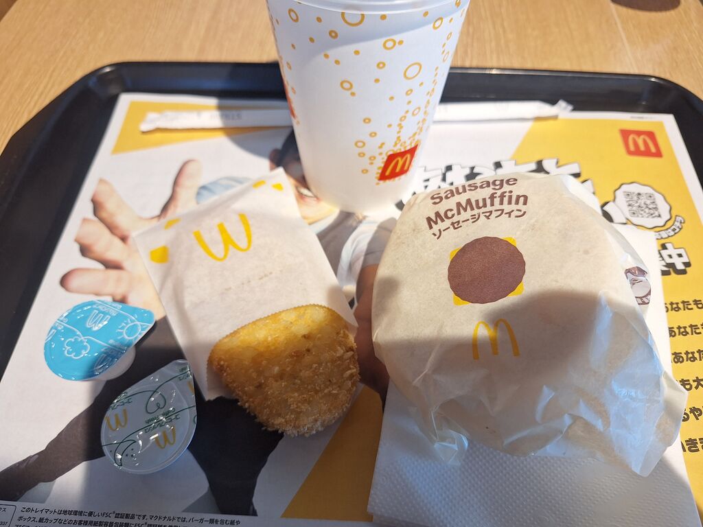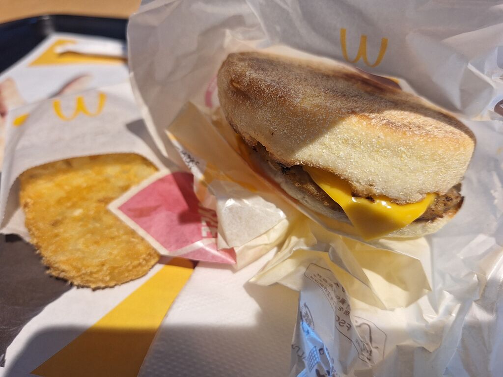 朝の時間帯だけ食べられる朝マックにハマり、子どもを部活に送った後に寄りました☆ソーセージパティは、塩気が効いていて、若干スパイシーさもあり、眠たい目も覚めます。マフィンとの相性もぴったりで、カリカリホクホクの“ハッシュポテト”と共に、朝からお得にお腹いっぱいです(^ー^) (訪問:2025/09/23)