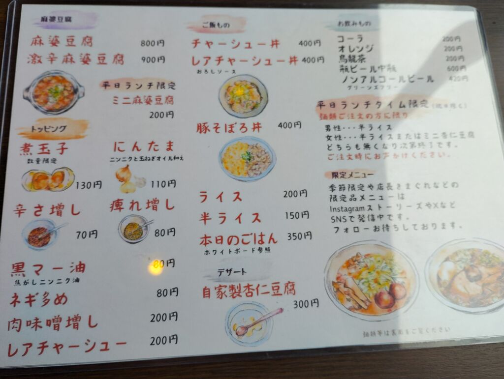 確かにマーボー豆腐が乗っていました。トロっとしたベージュ色の坦々スープ。香りの中に山椒の存在を感じました。まずはマーボー豆腐を少し食べてみました。このままご飯にかけてマーボー丼ができると思いました。さて混ぜてみよう。ん!?混ぜるほどに粘度が増し、飲むスープというよりは食べるスープとなりました。中細麺がスープと絡み、塊となった麺をすすらず口に入れました。混ぜそばの様子を呈してきました。麺を食べ終え、食べるスープが残りました。平日だと半ライスが無料でついてきます。それをスープに入れよくかき混ぜました。マーボー坦々飯にすると、より一層山椒の香りが際立ちました。 (訪問:2025/08/27)
