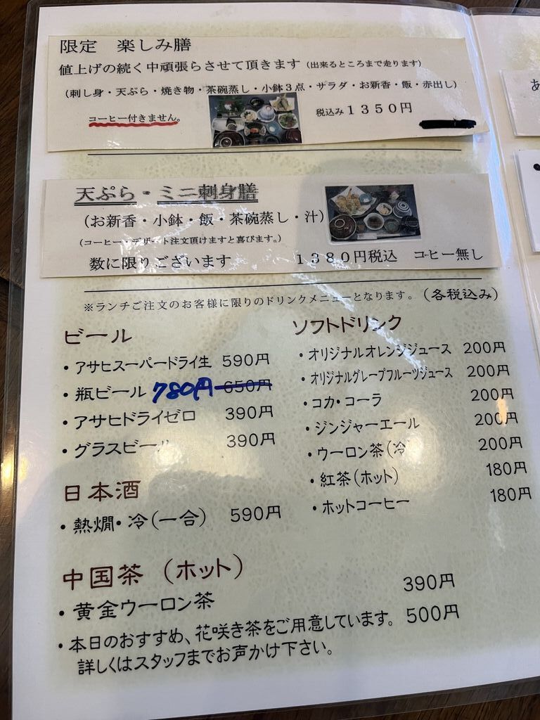 Instagramの掲載に惹かれて伺いました。楽しみ膳を頂きました。ごはん、味噌汁、刺身、天ぷら、焼き魚、サラダ、茶碗蒸し、卵焼き、小鉢3つで1350円というコスパの良さでした。味も美味くてクオリティが高かったので満足でした。楽しみ膳という名前通り楽しませて頂きました。アイスクリームもとても美味しかったです。人気店なので予約をして伺っているお客さんが多かったので、次回は予約をして伺いたいと思います。 (訪問:2025/07/06)
