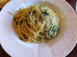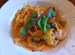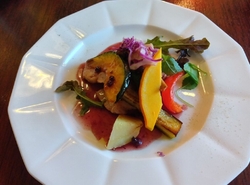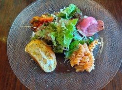 ランチは、初めてです。ビルのテナントの一角にあるオシャレなお店です。いくつかのランチメニューがあり、私はランチの「ヴェール」を注文しました。前菜から生ハムや生野菜などとてもボリュームがあり、とうもろこしの冷製スープも味が濃くて美味しかったです。生パスタは、トマトクリームソースと絡んでエビたっぷりで歯ごたえがあり美味しく、メインの豚肉料理も夏野菜たっぷりでカシスソースもさっぱりしていて最高でした。一緒に行った人のメイン料理の魚(カジキマグロ)には、バルサミコソースがかかっていました。飲み物とデザートの盛り合わせもついていて、満腹・満足しました。 (訪問:2025/08/26)