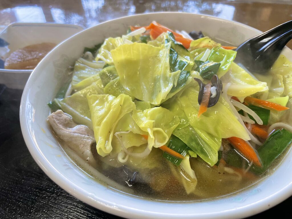 この店はホルモン炒め、レバニラ炒め定食、そのボリュームで有名ですが、今日は野菜が欲しくてタンメンを注文。炒め物と同じくニラが効いてます。キャベツ、キクラゲ、豚肉も加わり、シャキシャキ感とクタクタ感の良いバランス。タンメンもボリューム満点。麺になかなか到達しません。野菜の旨味が細麺に絡まり旨いです。味もボリュームも満足です^_^ (訪問:2025/12/22)