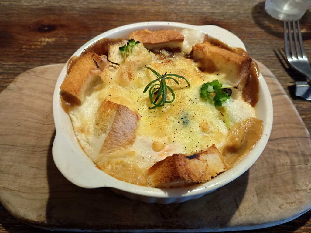 友達オススメのこちらに、初訪問です!店内は木のぬくもりにあふれて、温かく心地良い雰囲気です。とても迷った末にパングラタンのランチセットをお願いしました。前菜はちょこちょこと可愛らしく美味しいです。パングラタンはビーフカレー味で、ホワイトソースや卵も載っていてボリュームがありました。ミニデザート(写真撮り忘れ)とコーヒーも付いて、とても楽しく満足な時間となりました。 (訪問:2025/12/02)