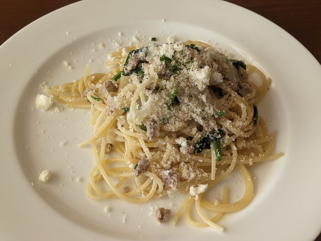定期的に変わるパスタを楽しみにランチへ。今回は自家製ソーセージとホウレン草のスパゲティパルミジャーノ風味(塩味)でした。ゆで加減が絶妙なパスタにシャキシャキの玉ねぎ、旬のホウレン草、ソーセージの旨味、パルミジャーノのコクが絡み、裏切らない美味しさでした。前菜もデザートも何を食べても美味しく、今回も幸せなランチとなりました。 (訪問:2026/01/05)