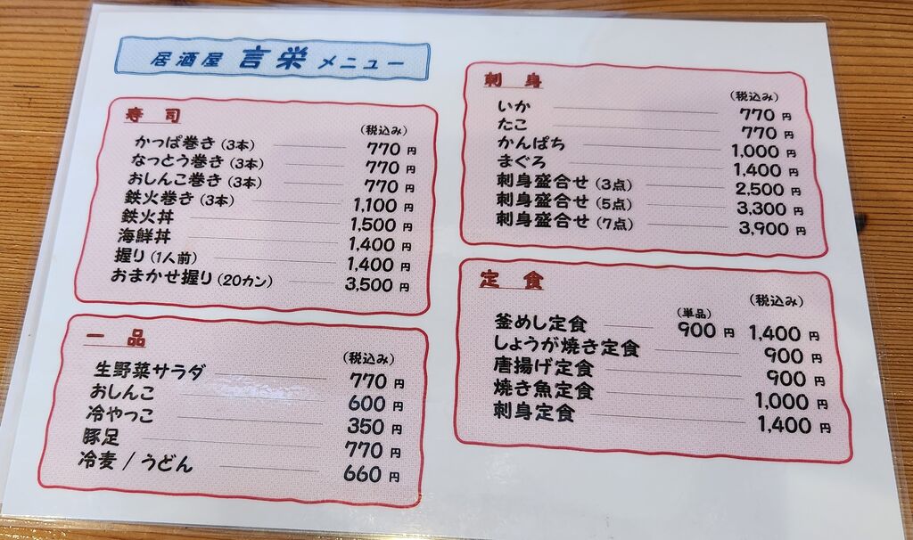 長年愛されてきた「言栄」が場所を変えてリニューアルオープン!お昼は「美味くて、安い!」と人気の定食が中心。夜は、寿司や定食のお食事から、焼き鳥、馬刺し、刺身などをつまみにお酒もどうぞ♪気さくな店主と女将がおもてなしいたします。