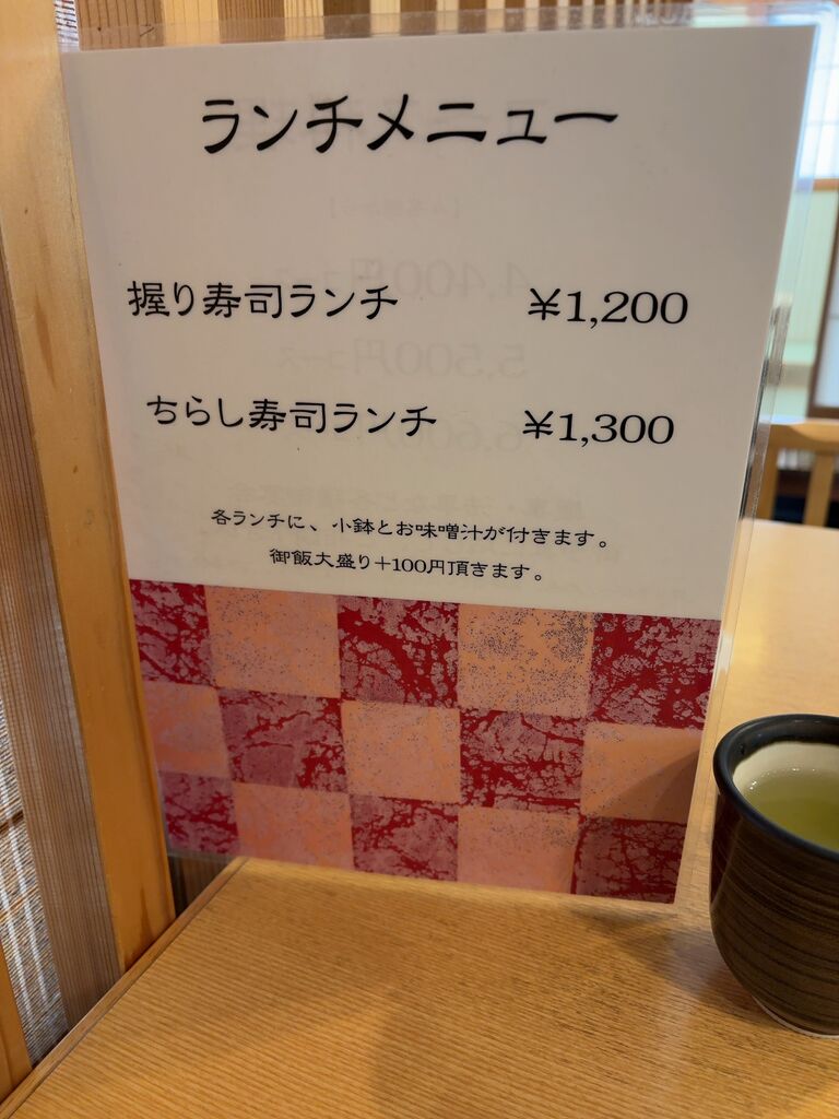 | ◇ランチメニュー | すしランチ1,200円 ちらしランチ1,300円 |