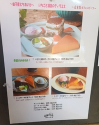 | 日替わりカフェスイーツが人気! 旬のフルーツを使った季節スイーツは日替わりで。春の苺、夏の桃やメロン、秋の栗、イチジク、お芋やカボチャなど。季節の味わいをお楽しみくださいませ。 |