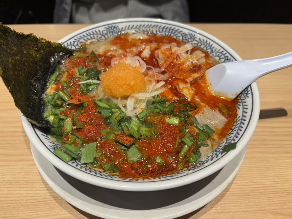 丸源ラーメン西川田店。野菜肉そば。辛肉そば。コシの強い細打ちストレート麺。途中からニンニクチップ投入し、豚バラ肉とニンニクチップによりスープにコクが増して美味しかったです!安定の美味さでした! (訪問:2026/03/18)