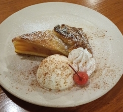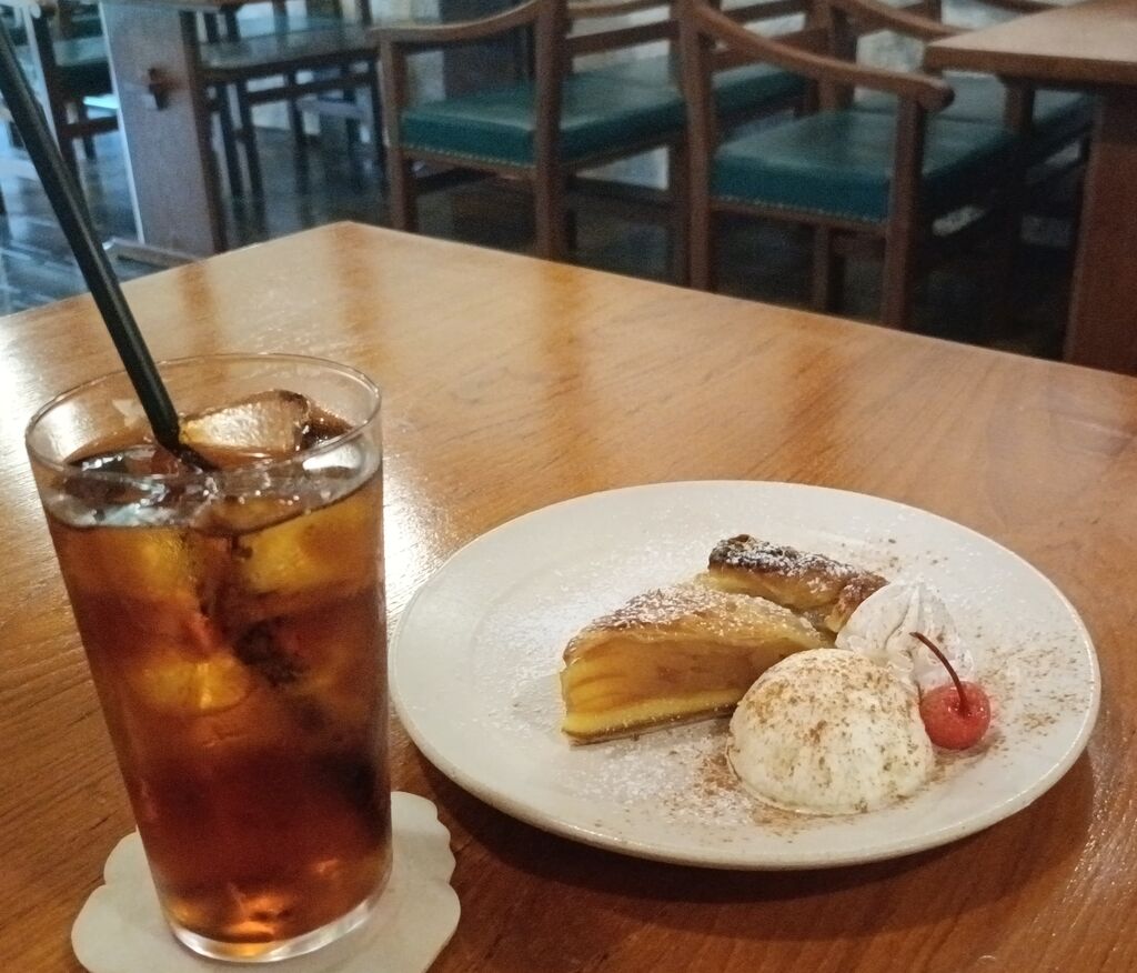 出流原弁天池で癒された後、近くにある老舗旅館一乃館でデザートタイム~♫ケーキセット【アップルパイ&アイスティー】をチョイス!パイはサクサクしていて中のりんごは温かい!添えてあるアイスや生クリームを絡め パイに染み込ませながら食べました(笑)アップルパイその物は甘過ぎす、りんごの味をしっかり尊重したケーキでした(笑)ホテル内や店内には昭和レトロなおもちゃなどが展示してあったり、奥の窓からは中庭が見え、鯉が優雅に泳いでる姿が目に入りました。居心地良く長居してしまいました(ૢ˃ꌂ˂⁎) (訪問:2025/09/03)