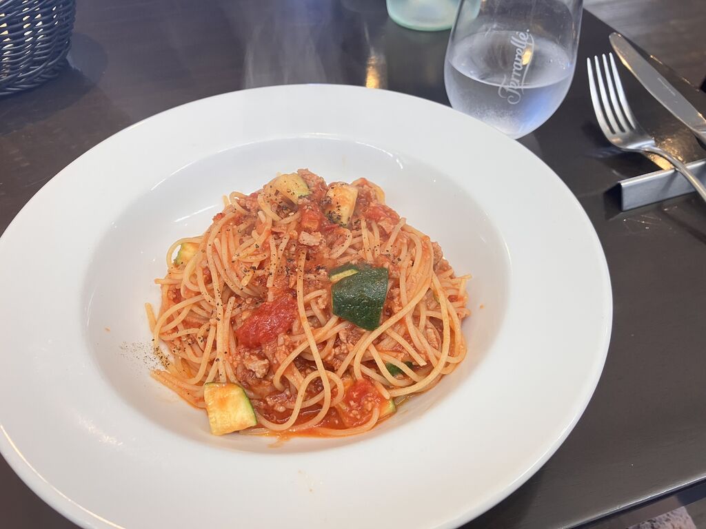 久しぶりに伺いました。ドルチェが付くBランチにしました。メインのパスタは5種類から。地鶏モモ肉とカボチャの煮込みソーススパゲッティローズマリー風味を選びました。鶏肉とカボチャがゴロゴロ入っていて、ローズマリーの香りがとっても爽やか。前菜も一つ一つがとても美味しく、これだけですでに満足です。パンも付きました。ドルチェはパンナコッタでとろ〜り濃厚。食後は選べるドリンクから桃のアイスティーにし、すべてが美味しかったです! (訪問:2025/11/03)