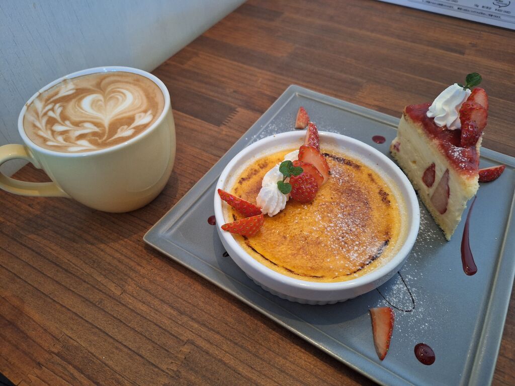 年末から年始までぶっ通し営業と聞いており、元旦の参拝後是非お邪魔したい‼と願い、14時前に到着。駐車場もほぼ満車、店内もほぼ満席の大盛況っぷり。なんとか着席でき、『フレジエ750円』『クレームブリュレ650円』に『カフェラテ660円』でオーダー。イチゴの爽やかで甘~い香りが食欲をそそりまくる大好きなフレジエ。年始早々頂けるとは幸先由です。甘い香りはしますが、甘さは控えめでイチゴの美味しさが楽しめる素敵ケーキ☆クレームブリュレの表面はパリッパリ‼コクのあるお味ですがしつこくなく、スプーンが止まらない美味しさ♪カフェラテもスッキリとして美味しく、ケーキ類とも良く合い絶品でした^^美味しい時間が年始から楽しめて幸せでした‼ (訪問:2026/01/01)