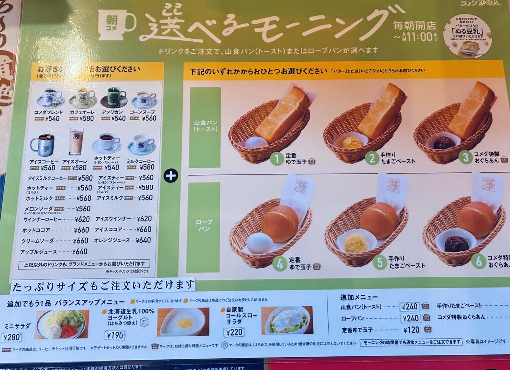 | ◇選べる「モーニングサービス」ドリンクご注文のお客様に無料で焼きたてのトーストと温かいゆで玉子を提供しています。ゆで玉子の代わりに手作りのたまごペーストか名古屋名物の小倉あんもお選びいただけます。 | ドリンク代 420円~ 【開店から午前11時まで】 |