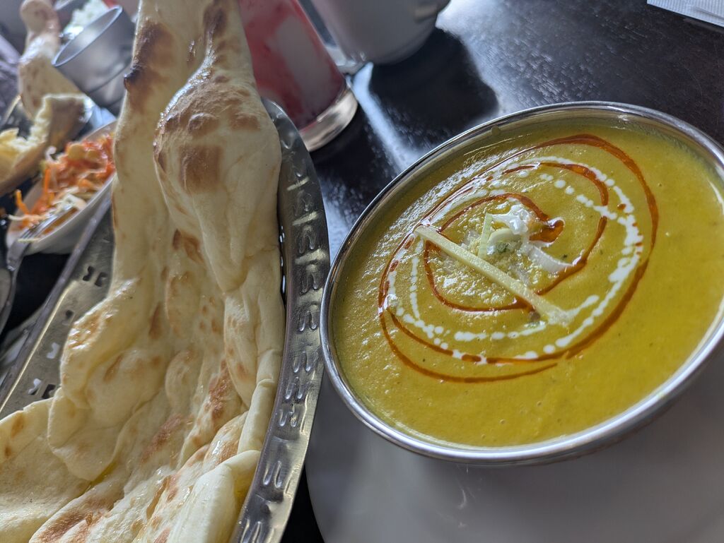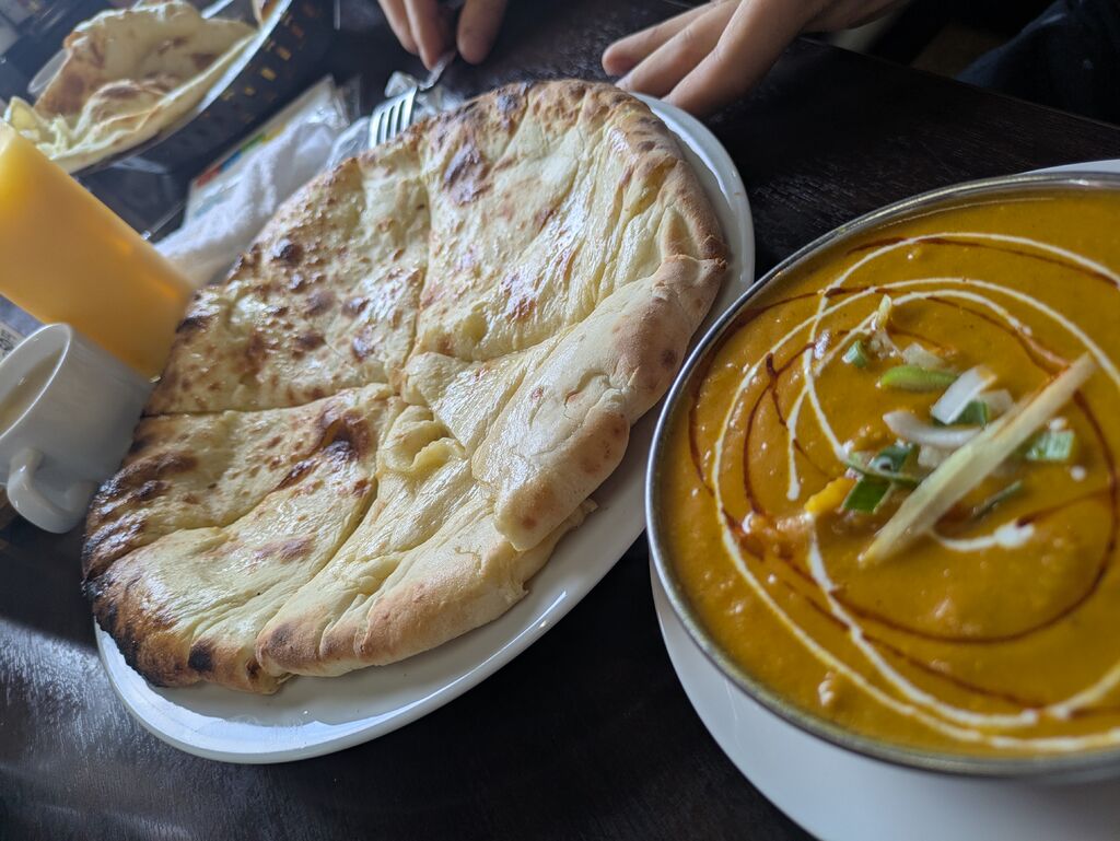 4ヶ月ぶりに来ました。今回は初めてレディースセットをオーダーしてみました。というのは好きなカレーとナンが選べるので。メニューみて目に入ったかぼちゃのかれーとチーズナンが気になり中辛(ホット)にして頼みました。それほど待たずに到着。いろなお店でカレーは食べましたがチーズナンは初めてで見てびっくり。食べられるかなぁ?と思いながらそれでも美味しく頂いてましたがやはり残り2切れは残ってしまいパックを頼んで持ち帰りにしました。かぼちゃカレーもかぼちゃがゴロゴロ入ってて美味しく頂きました。ご馳走様でした。 (訪問:2025/10/22)