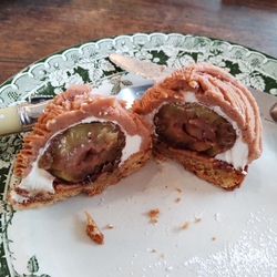 いちじくと紅茶のロールケーキ650円と栗のタルト750円を注文。今シーズン初のいちじくを使ったスイーツです。瑞々しいいちじくとこっくりクリーム、幸せです。栗のタルトはタルト生地がザックリ固めなので、ナイフを使うと食べやすいです。中には大粒の栗がゴロリ。贅沢に秋の訪れを堪能しました。 (訪問:2025/09/25)
