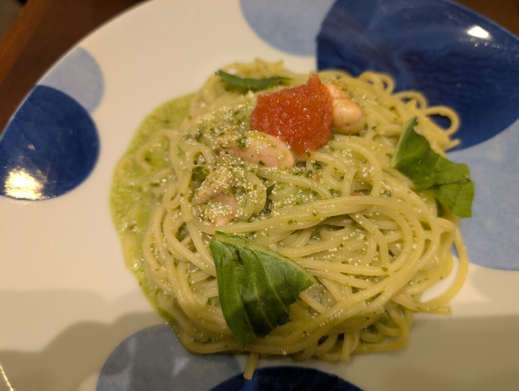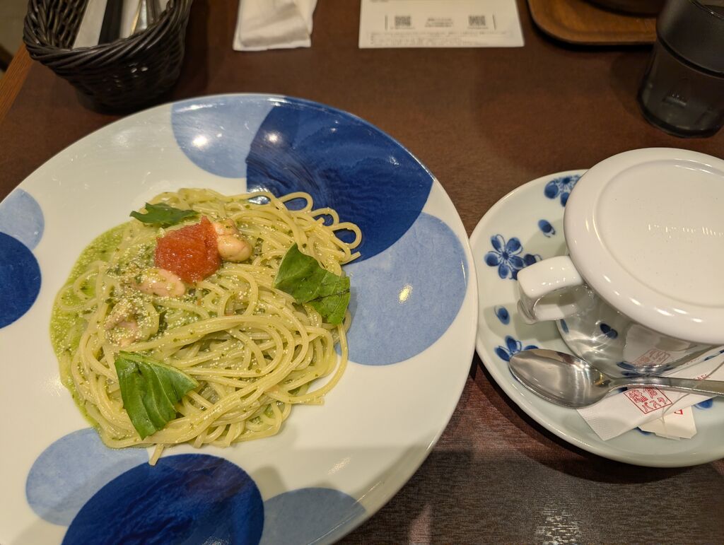 11時前に入店、ランチセットでたらこ明太ジェノベーゼのドリンクセットにしました。スパゲッティ麺で注文しましたがウェイビーな麺がソースとからんで美味しかったです。パンセットならパンでソースを回収出来ますね。ドリンクはノンカフェの紅茶、ティーパックタイプでした。ウニの贅沢パスタが美味しそうでした。 (訪問:2025/10/22)