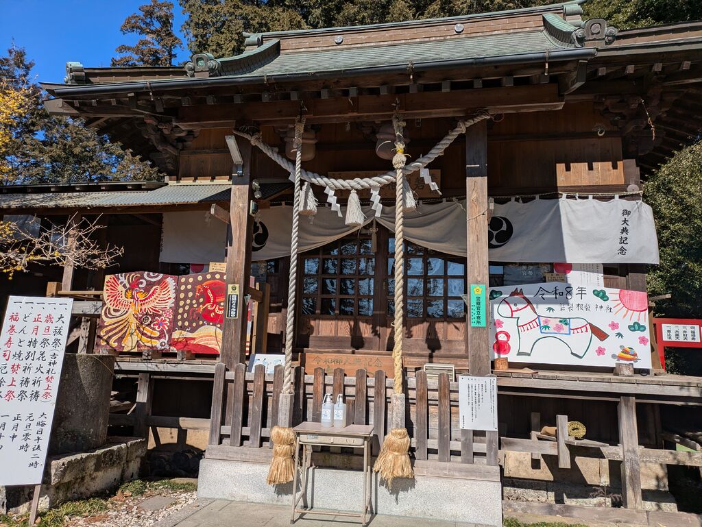 初詣には遅かったのですが、ここ数年1月によくお参りさせていただいたので今年も伺いました。青空で風が強い中に蝋梅が元気よく咲いて、社殿前には今年も可愛い干支の絵があります。恵方神社でもありますが今年は南南東が恵方とのこと。社務所がお休みでしたので書置きの御朱印をいただきました。 (訪問:2026/01/22)