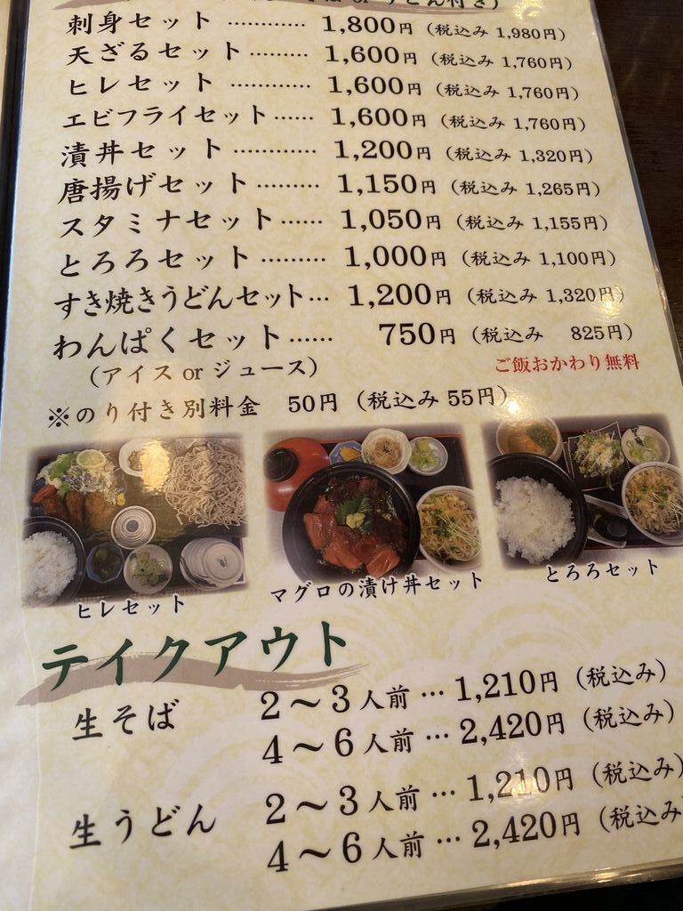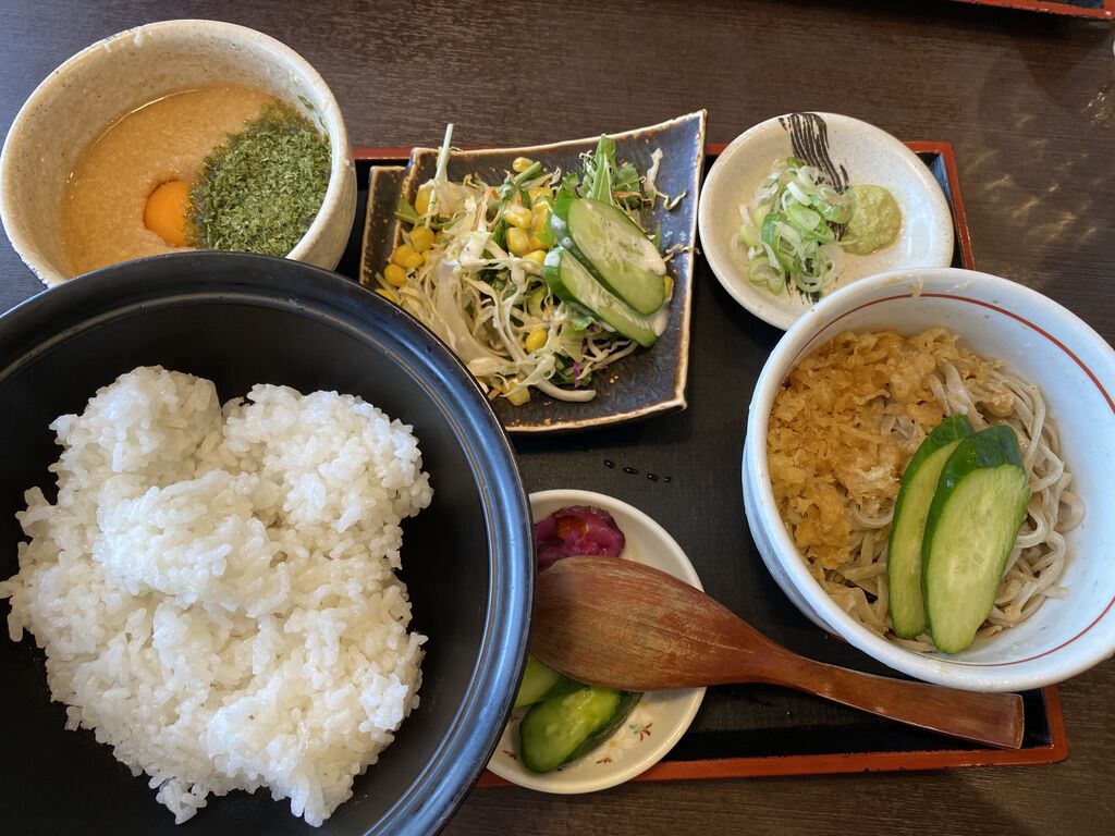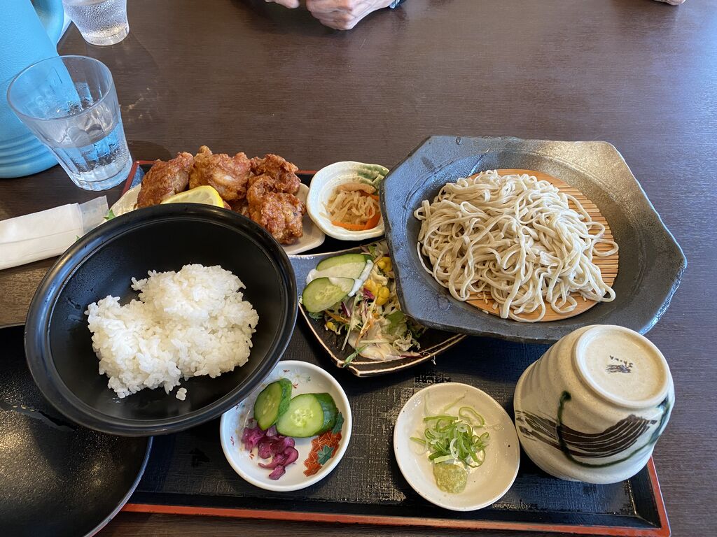 初めて4人でランチ訪問しました。私はとろろセットを。とろろ、たぬき蕎麦(うどんでも大丈夫)、サラダ、香の物、白飯がセットになっています。混んでいたので提供までは待ちました。運ばれたセットはお洒落で見ただけで食が湧きます。喉越しが良いお蕎麦や卵とあおさ粉を混ぜて白飯にたっぷりかけて頂くと、極旨であっという間に完食です。食べきれなかった母が頼んだお蕎麦もお手伝いしました。同行の息子が頼んだ唐揚げセットも美味しそうで写真を撮りました。初めての訪問ですっかりお気に入りに。次回は何を頼むか今から楽しみです。 (訪問:2025/08/17)