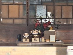 | ◇御神威 黒だるま 御神体山である尾鑿山を形にうつし御神威を戴く、珍しい黒塗りのダルマ。商売繁盛を祈念する参詣者に「黒字だるま」として信仰篤い。 |
