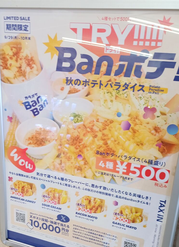 カラオケBanBanさんで歌ってきました。カラオケBanBanさんではフライドポテト食べ放題キャンペーンが行われていました。実施期間は2026年1月13日~2026年3月31日までです。無料のフレーバーも選べるとのことです。学生は一律500円とお手頃価格ですね。定期的にキャラクターとコラボしたキャンペーンも行われていますよ。 (訪問:2026/01/25)