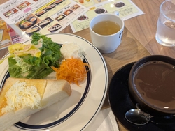 遅めのお昼におじゃましました。ぶどうパントーストセットは売り切れていました。お得なトーストセットを注文。ドリンク付きです。ふっくらしたパンにふんわりバターが乗って美味しいです。ドリンクも色々な種類から選べてプラス料金で更に選べるドリンクもあります。ポイントカードがあり、期間限定で2倍ポイントをやっていました。 (訪問:2025/12/24)