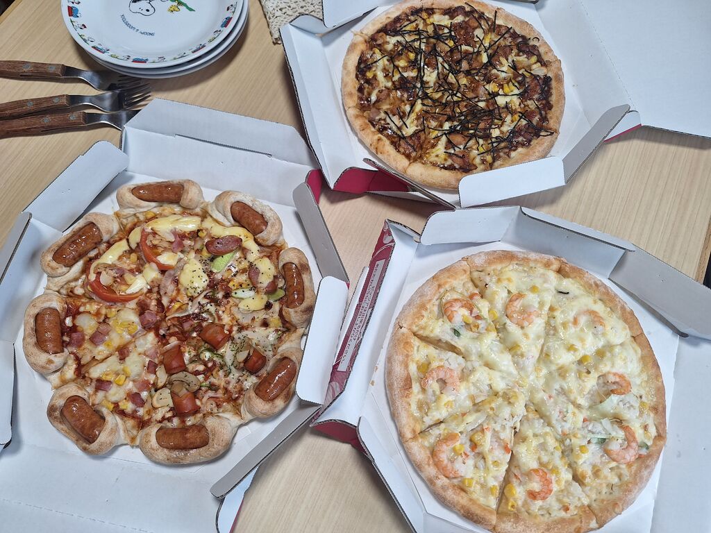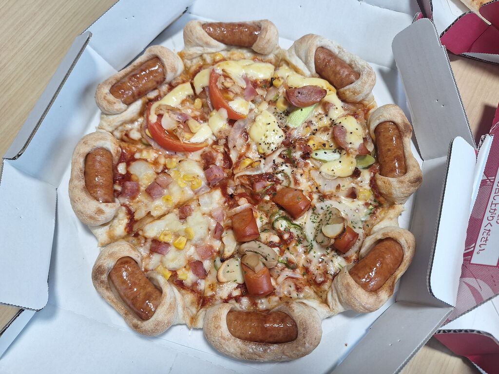 夏休み終わりの頃にやり残した事を話していて、子どもとピザを食べていない!という話になり、お昼はピザに決定☆オーダー開始の10:30に電話注文して、11:15受け取りできました。期間限定の“クォーター夏のみみドッグ”をチョイス。①ジャーマン②ピリ辛チョリソー③ピザッツコンボ+トマト④アスパラコンボの4種類が楽しめます。みみにウィンナーが入っていて食べごたえがあり、別添のケチャップも嬉しいです。No.1人気の“テリヤキスーパーチキン”と、スタッフオススメの“エビプリドリア”も購入。Mサイズパン生地で3枚5200円でした。テイクアウトで半額なのが大きいです。35周年だそうで、ホント子どもの頃から慣れ親しんだ味です(^ー^) (訪問:2025/08/27)