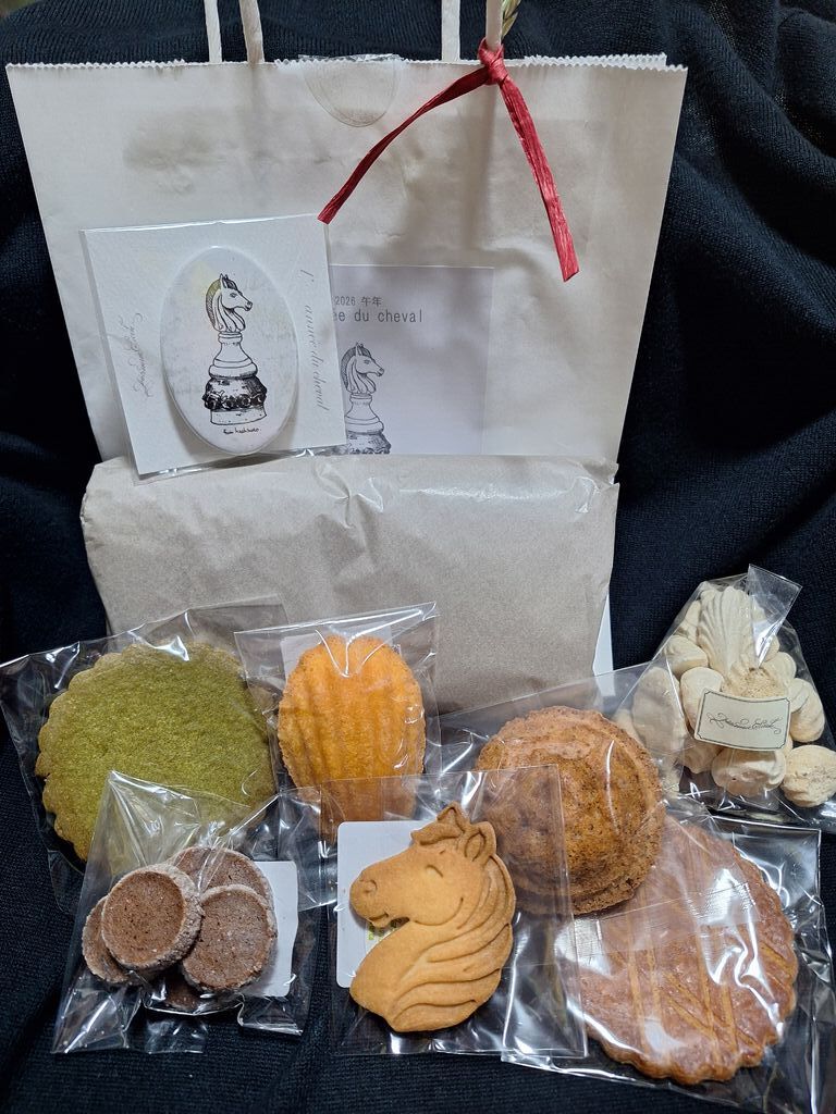 お友達との送別会を兼ねたお茶会に美味しいケーキを!、そして毎年の楽しみの『福袋3700円』をゲットすべく14時前にお邪魔しました。キラリと輝くケーキはいつ見ても悩ましいくらい魅力的。『ガトーショコラ610円』『シャンティフレーズ690円』『モンブラン780円』『ムラングシャンティマロン640円』『ロールケーキ切れ端420円』をゲット。好きなの選んで~!と皆さんに選んで貰い私は残ったものを。ガトーショコラが来てくれました‼ずっしり重そうな見た目と反する軽~い食感と口溶けのガトーショコラ。パクパク食べ進めてもくどくなくペロリといただけちゃう美味しさに感動☆お友達も1口、2口と食べ、何これ!?軽い‼美味しい‼と絶賛の嵐^^これどこの!?千葉の?!いえいえ、宇都宮ですよ。とお話しすると、絶対行く~‼と大喜びでした。大好きな物が大好きな方々に絶賛されるのってとっても嬉しい♪たっぷり焼き菓子が入った福袋。午年らしく馬のクッキーがキュート‼その他の焼き菓子もどれも美味しいものばかり。少しずつ食べて幸せ噛み締め中。何を食べても美味しいシエクルさん、年末年始に癒され真っ最中です‼ (訪問:2025/12/28)