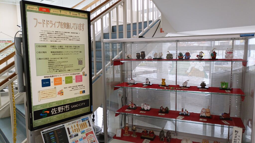 150っと周遊デジタルスタンプラリーで訪れました。さのまる自販機2台が目立ちます。市内に関するお知らせ、観光などのチラシが一列に並んでいて見やすいです。今まで気が付きませんでしたが栃木県伝統工芸指定 佐野土鈴 相沢民芸の作品がショーケースに飾られております。干支、獅子舞、宝船などの御目出度くホッコリするような作品が見られました。 (訪問:2024/01/14)