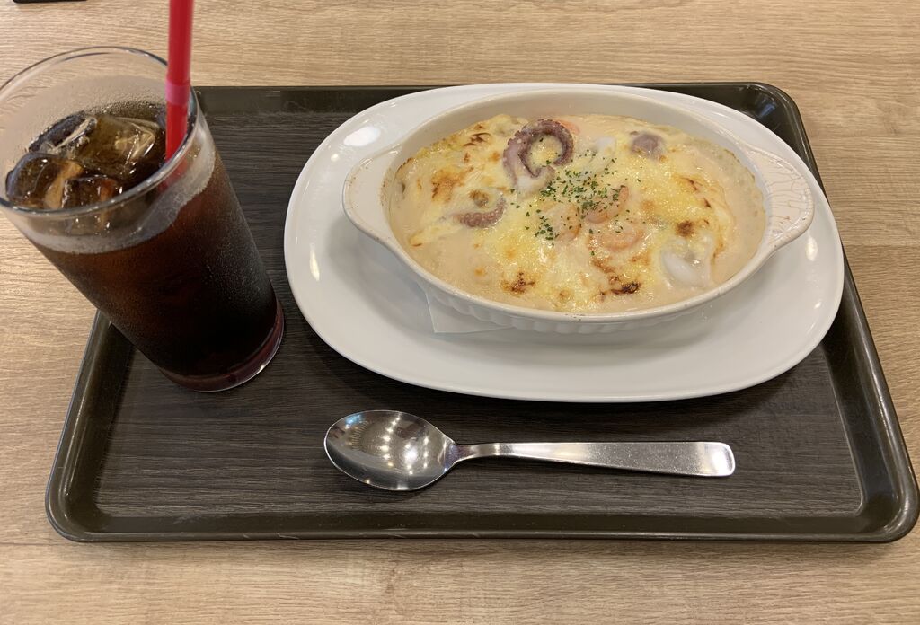 「FKD宇都宮店」の一階にあるお店。先にレジで会計を済ますシステムです。今回は「シーフードドリアとドリンクのセット」を注文しました。ドリアは、エビ・イカなどのシーフードに加え、びよ~んと伸びるチーズもたっぷり入っている点が嬉しい! 飲み物はアイスコーヒーを選びました。熱々のドリアと冷たくて爽やかな苦みのコーヒーに癒され大満足です。 (訪問:2025/08/22)