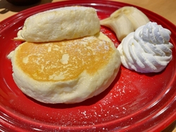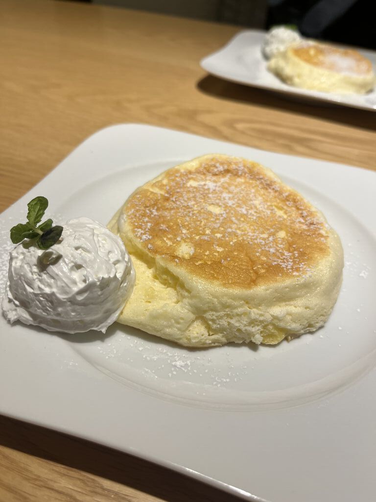 | ◇ふわっとろパンケーキ(蜂蜜入メイプルシロップ添え) ご注文毎にメレンゲを立てて生地を合わせ、丁寧に丁寧に焼き上げます。 |