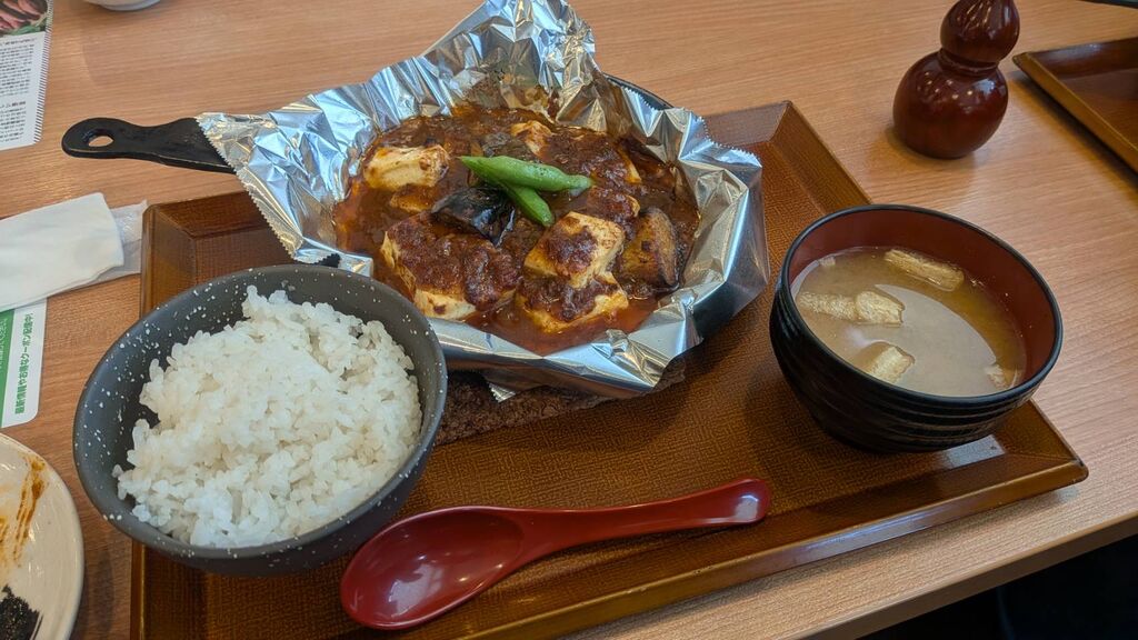 「麻婆豆腐定食」をいただきました。鉄板で提供されるのでアツアツが嬉しい。大きめにカットされたお豆腐は絹どうふなので滑らかで美味しい。ひき肉たっぷり。辛味もしっかりしていてご飯が進みました。寒い冬にピッタリ。しっかり温まりました。 (訪問:2025/12/09)