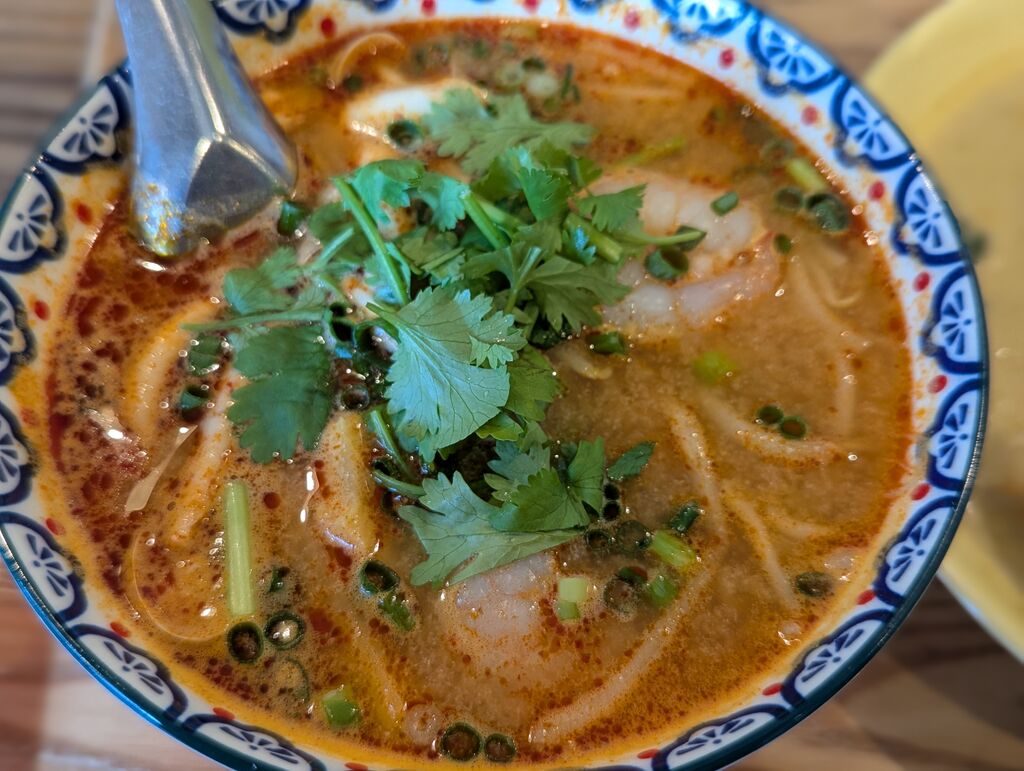本格的なタイ料理が食べられると聞いて来店しました。ランチタイムは麺とご飯もののハーフセットが3種類ありました。私はグリーンカレーセットを注文。麺はタイラーメンかトムヤムラーメンのどちらかを選べますので、トムヤムラーメンを選んでみました。グリーンカレーは青唐辛子のシャープな辛さとココナッツミルクの柔らかな甘さが融合された甘辛さが大好きです。鶏肉や野菜も柔らかくて美味しかったです。トムヤムラーメンも酸味と辛味に加えてパクチーなどの香草も加わり複雑な味がたまりませんね。米粉の麺ですので、あっさりとしていてツルんと美味しくいただきました。 (訪問:2025/10/20)