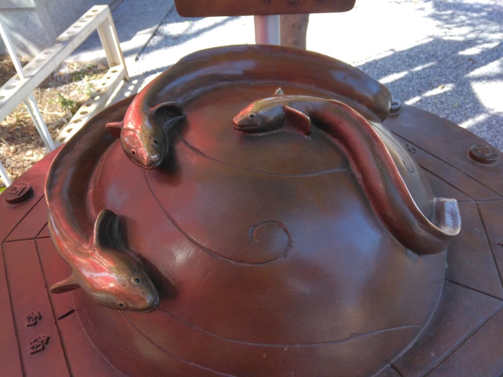 | ◇なでうなぎ 神仏習合時代には虚空蔵菩薩が合祀されていた背景から、そのお使いとされる"うなぎ"をお祀りしています。うなぎとご自身の干支をなでお祈りください。 |