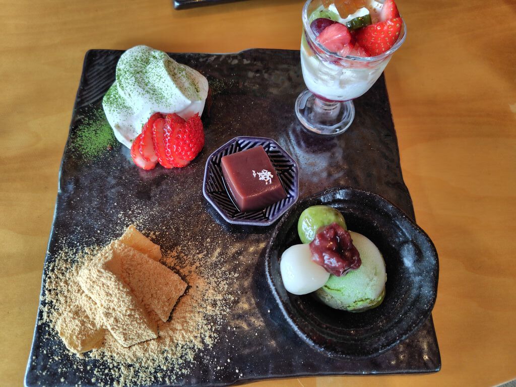 友人とお茶しました。【プレート飲み物付き(1210円税込)】で飲み物はコーヒーとお抹茶、選べるアイスも抹茶アイスにしました。水羊羹にわらび餅、白玉で和菓子が多いプレートです。友人も眺めが良く落ち着いてゆっくり出来るお店だと喜んでいました。 (訪問:2025/05/18)