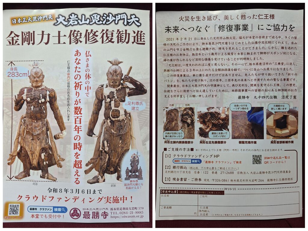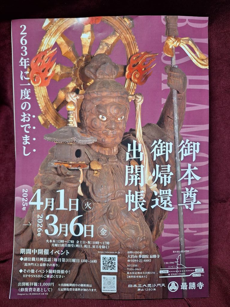 こちらの秘仏でご本尊様の毘沙門天様の御像を拝観できると数日前に知り、慌てて参拝に伺いました。というのも令和7年4月1日~令和8年3月6日までというスケジュール。ここしかない‼以前より参拝したいなぁと思いつつなかなか機会もなく、絶好のタイミング‼途中すれ違うのも難しいような山道を車で進み、本堂下の駐車場に無事到着。石段を上がり出迎えてくれた山門の阿吽の仁王像様。修復されたと伺いましたが、不自然な修復ではなく、何百年も前からそのお姿で見守っていてくれているかのような完璧な修復に技術の高さを知ることが出来ます。本堂に向かい参拝。毘沙門天様にお会いしたく本堂の中へ伺うとちょうど護摩祈祷が始まり拝観が出来ないと。護摩祈祷後なら大丈夫と伺い、周りのお社の参拝をしたり、御神木の杉を見たり、富士見台からの眺めを堪能したりするなどしていたらあっと合う間にお時間。副住職から様々説明があり、これがまた面白いお話しの数々で、普段なら10分程度の説明のようですが、最後だからと1時間半ほどたくさんのお話しを聞かせていただけました。お話しがとてもわかりやすく、難しい言葉を使わず、四天王をアイドルグループのように例えてみたりと笑いも交えつつ素敵なお話しの数々で、今日ここに参拝にこれて本当に良かった‼毘沙門天様と奥さまの吉祥天様、御子の善膩師童子様の3体の御像が厨子からお出になられ、このような一般公開されたのは開山後初だとか。江戸の頃も修復でお出になられたようですが、秘仏としてずーっと厨子の扉が空くこともなく(今は毘沙門様の縁日である1日のみ扉が空くそう)、ほぼ公開など無い状態とのこと。足利の山火事が今回の修復と公開のきっかけになったそうで、不謹慎ながら公開のタイミングに参拝できたのは嬉しいかぎりです。次回は200年後頃に修復があればこのような機会に恵まれるかもとのこと。長生きできませんので、良いタイミングでした。とても良い場所で、今後も機会を見て参拝したいです。 (訪問:2026/03/01)