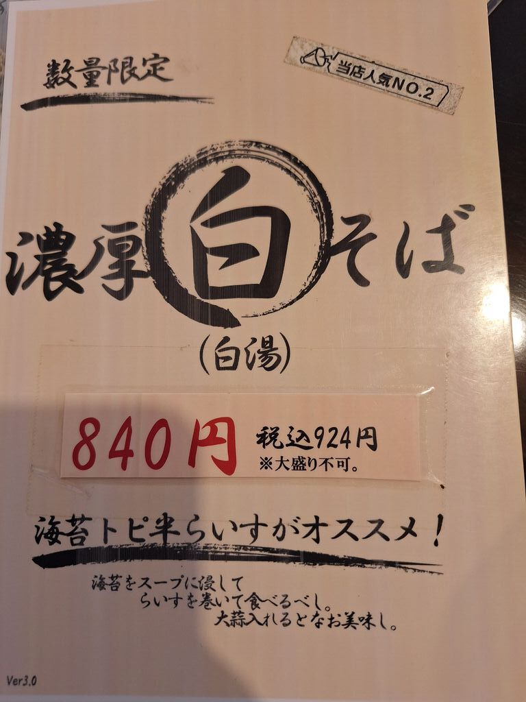 前から行きたかったこちらのお店に初来店。開店直後に到着しましたがすでに満席でした。入店すると記名表に名前を書き、呼び出しベルを待ち、待つシステムでした。当店人気No.1の味玉しょうがそば+唐揚げセットを注文。 スープは、スッキリとしていて主張しすぎない煮干しベースに、鶏がいい仕事をしてくれてます。 麺は細目のストレート麺で、麺量も結構ありました。チャーシューが鶏と豚と2種類入っていて、しっとりとしていて旨味もあり、美味しかったです。たっぷりの生姜玉を崩しながら、いただきました。全体的にバランスがよく、丁寧に作られている感が伝わり、大満足でした。セットの唐揚げの下に敷かれていたオニオンスライスも、さっぱりしていてよかったです。 (訪問:2025/06/01)