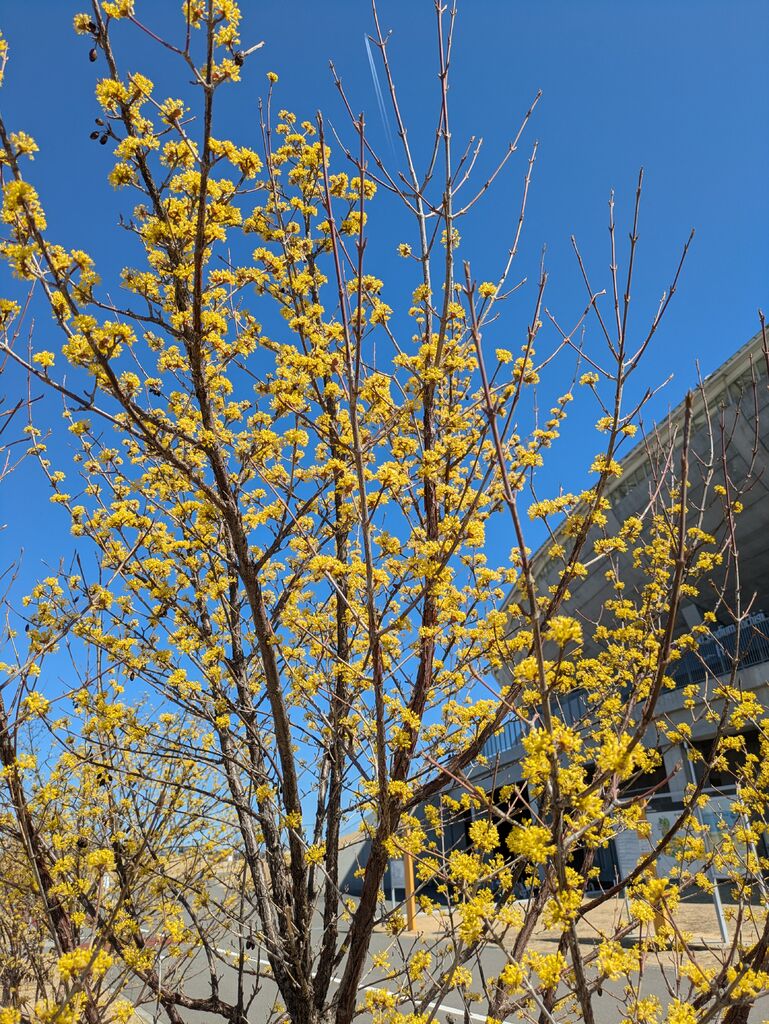 久しぶりにウォーキングに来ました。スタジアム西側にサンシュユでしょうか?黄色い花を咲かせ、隣のジョギング・ウォーキングコースでは、まだ若い桜の木が数本早くも青空をバックに花を咲かせ始めていました。真冬の空気が澄んでいるときに見える富士山が見えないのが残念でしたが、日差しも暖かく気持ちよく1周しただけでも汗をかきました。(^^)/ (訪問:2026/03/15)