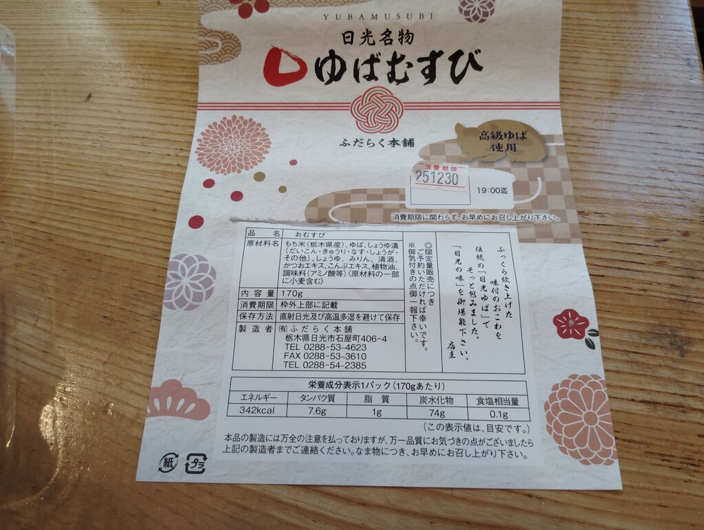 今日は、 日光市 ふだらく本舗 石屋町店さんに来ました。お目当ては、湯波むすびです。湯波なおにぎりです。1パック、2個入りで、600円(税込み)です。今回は、3パックを購入して、2パックは、テイクアウトして、1パックは、店内で、食べました。スタッフさんによると、次から次へと作っても、すぐに売り切れちゃうと言ってました。なので、今、できた、出来立てですと言ってました。ほんのり、あたたかい湯波むすびです。お上品な味つけな湯波に包まれた、甘みのあるおこわ(もち米)で、絶品にうまい。嬉しいことに、漬物が、2個も入っています。すごい気配りですね。ごちそうでした。 (訪問:2025/12/30)