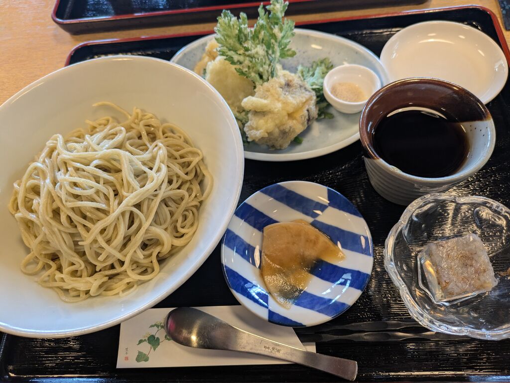 リピート来店。おそらく今年食べ納め。まだこの時点で夏メニュー。この日はほぼ満席(4席1テーブルで7、8組くらい)。天盛り蕎麦を選択。気温が下がったおかげで快適に食べられた。個人的に野菜の方が好きなので、野菜天ぷらなのは嬉しい。ここの蕎麦はツルっと食べやすい。今度行く時は、限定の蕎麦を食べてみたい。営業時間午前11時〜午後2時と火曜定休(祝日等関係なく固定)。 (訪問:2025/09/20)
