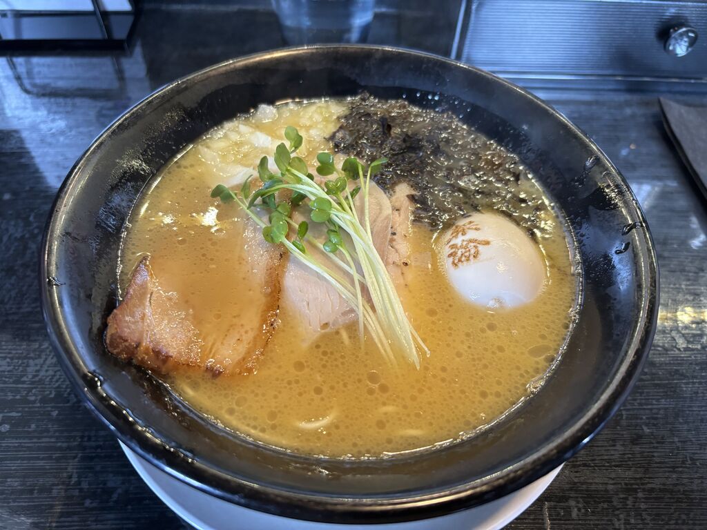 買い物ついでに、麺双架論さんへ。鶏豚骨(白)、味玉付き。ライトなスッキリした飲み易いスープでパツパツの歯切りの良い麺が食べ易く美味しかったです!替玉一回お代わりしました。 (訪問:2025/11/02)