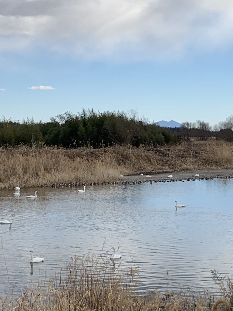 | 広い河川敷からの眺望 | 天気が良ければ元旦には白鳥の背景に筑波山と初日の出が楽しめます。 |