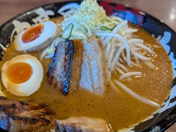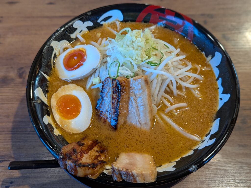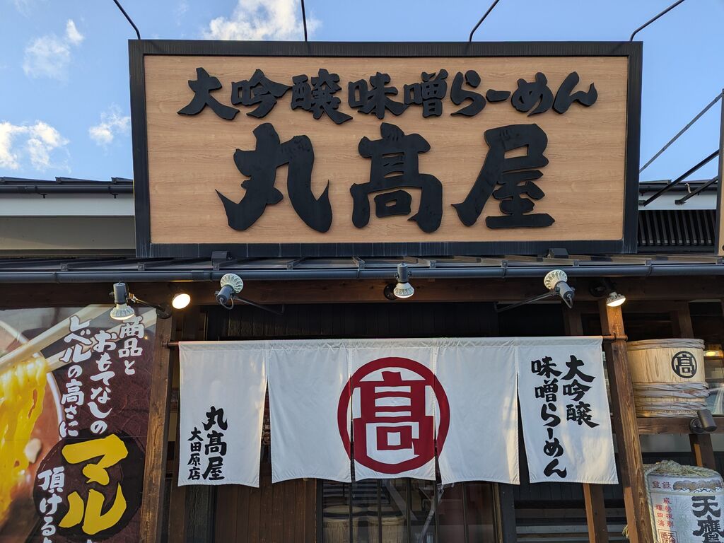 味噌ラーメンが食べたくて「丸高屋」さんにやってきました。15時過ぎでしたが満席状態な人気ぶり。待っている間に壁に貼ってある”年末年始限定メニュー”を発見。その名も【大吟醸丸高屋プレミアム味噌らーめん】しかも、丸高屋グループ全店で使えるクーポン付きです。これで決まりでしょ~という事でタブレットで注文。スープは甘めでクセがなくて飲みやすい。2種類のチャーシューも柔らかくてトロトロでした。炙りチャーシューが香ばしくて美味しかったです。野菜の上にトッピングされていた生姜をスープに溶かすとスープが引き締まり味変も楽しめました。元気な店員さんの気配りも有難かったです。 (訪問:2026/01/04)
