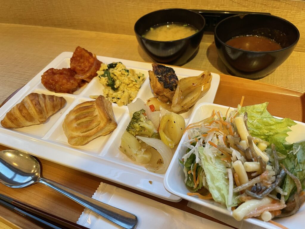 | ◇焼立てパン健康朝食 毎朝焼き上げるサクサクの焼きたてパンやオーガニックサラダ・佐野市の郷土料理「いもフライ」を是非お召し上がりくださいませ♪ |